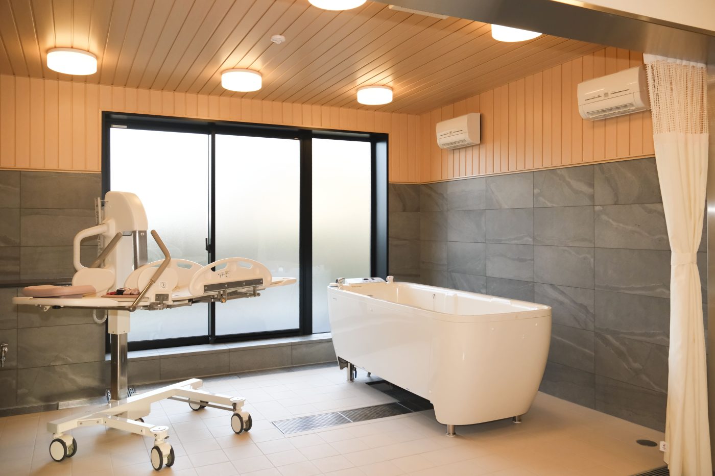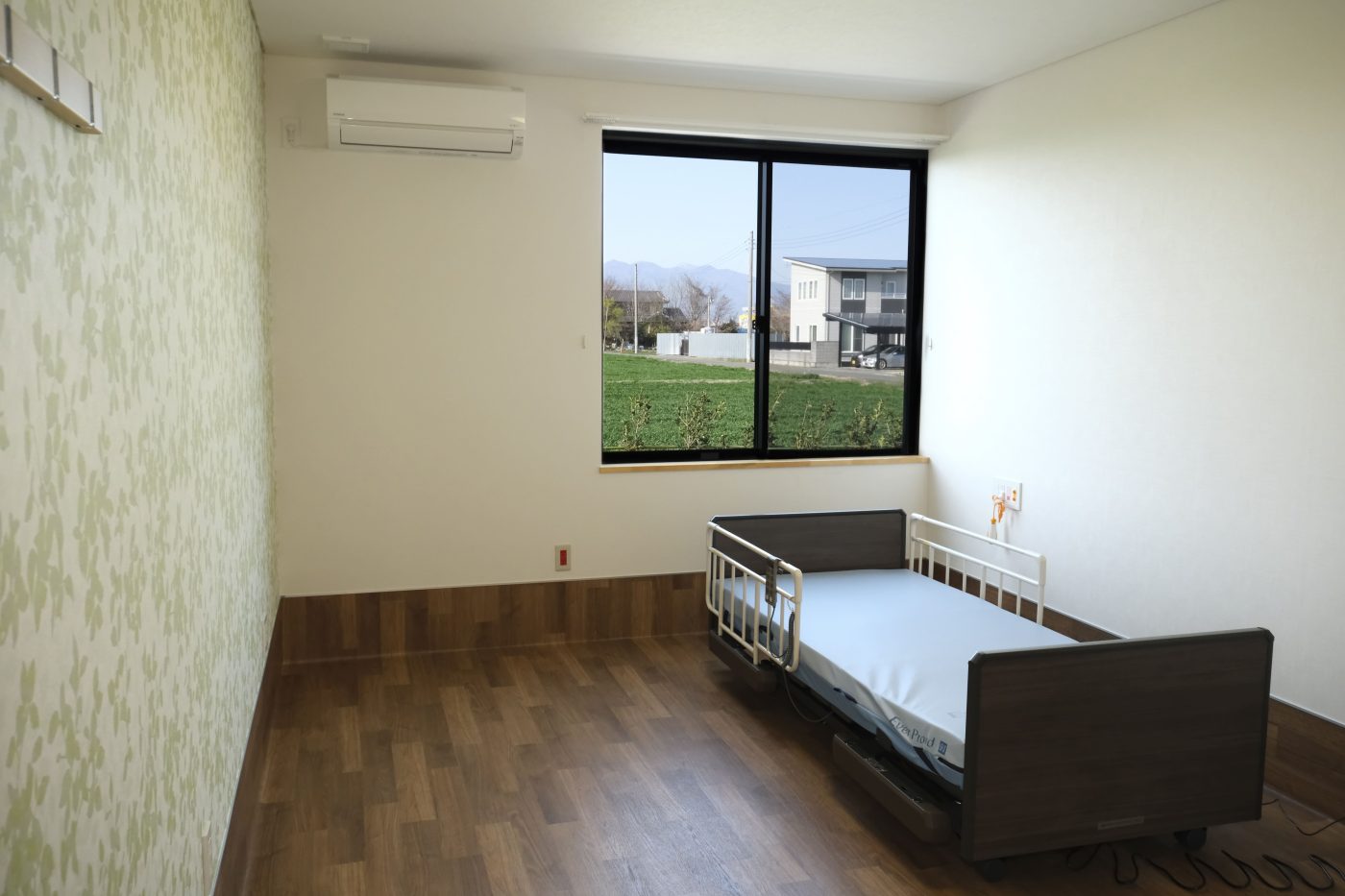 デイサービスでは、円形の天井と円形照明がアクセントとなっている。大きな窓からは庭が望め、四季を楽しむことができる空間である。
