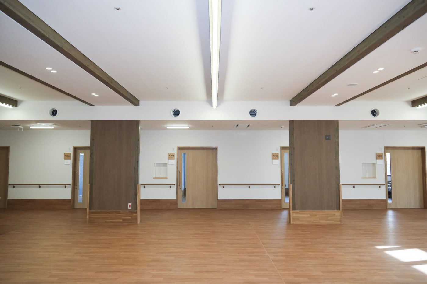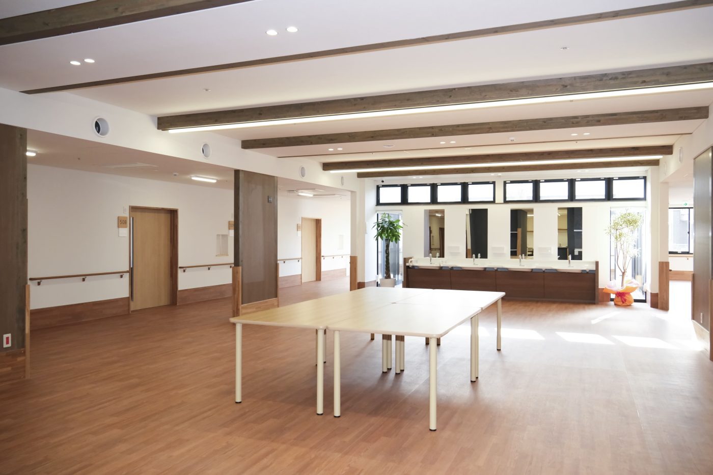 有料老人ホームの食堂は、木製梁や柱を表しにし、木の温かみを感じられる空間である。